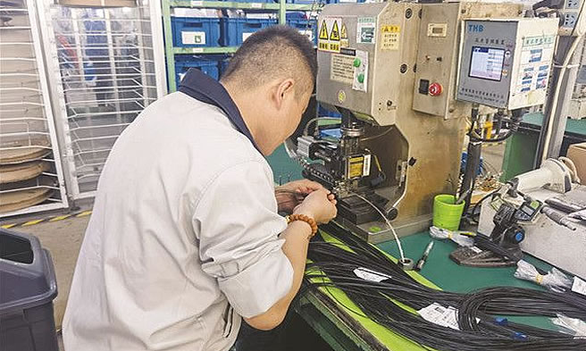 在信亚机电,一条几十米长的成捆电线如何摇身变成汽车线束?刘燕介绍,需要经历裁线、组装、压线等40多道工序,为了保证最终产品质量,每一道工序都“跟踪记录”,产品从原料到出库需要经过5道“检查关”。